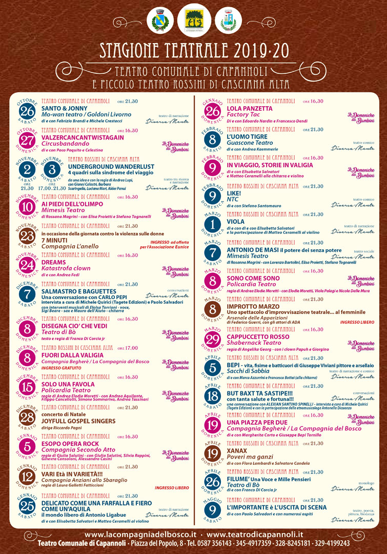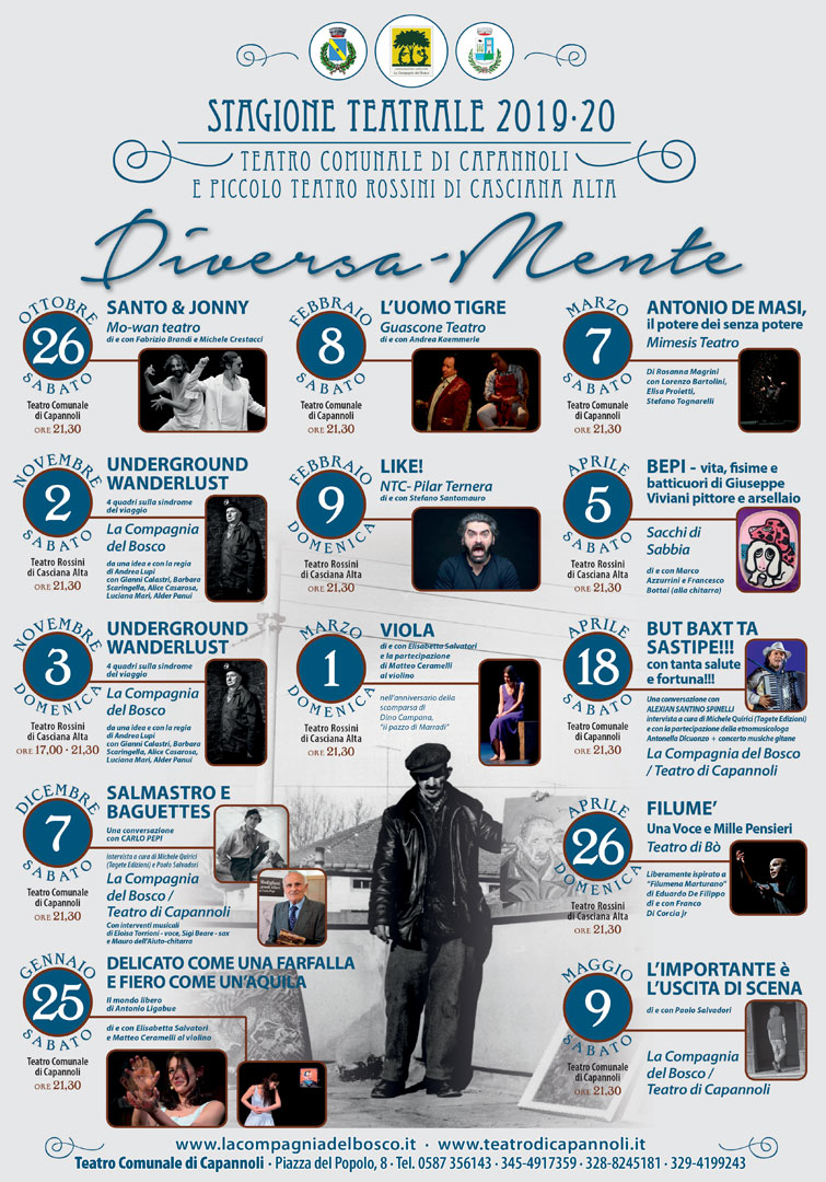 La Compagnia del Bosco e Il Teatro Comunale di Capannoli propongono una Stagione Spettacoli 2019-20 anche quest’anno densa di appuntamenti.Continua la scelta di sentirsi una realtà teatrale non assimilabile che pur con un importante legame col territorio si distingue per una direzione artistica propria che non segue strade scontate o prefissate (cosa che la ha portata in pochissimo tempo a diventare un piccolo ma autorevole punto di riferimento per il sottobosco teatrale della provincia di Pisa e non solo),un teatro e una stagione che in qualche modo cercano qualcosa, forse of rendo più domande che risposte.